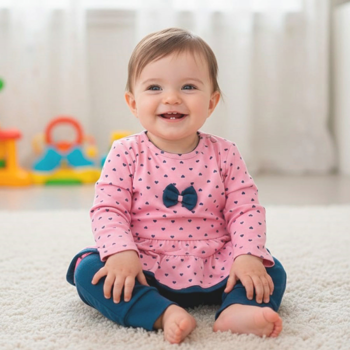 Conjunto Blusa Manga Longa com Mijão, Enxoval para Bebê, Composto por 02 Peças, Disponível nos Tamanhos P, M e G, Detalhe: Laço com Strass, Cor: Marinho/Rosa, Tecido: Malha.