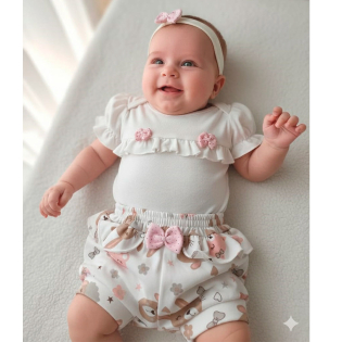 Um conjunto elegante e cheio de estilo para sua bebê esbanjar charme para onde for. Os detalhes fazem toda diferença, o body é modelo manga curta com um botãozinho no ombro, conta com decote arredondado e fechamento entrepernas por botões de pressão e o shorts possui modelo com elástico na cintura. Esse conjuntinho é ideal para o verão deixando sua bebê super á vontade e fresquinha.