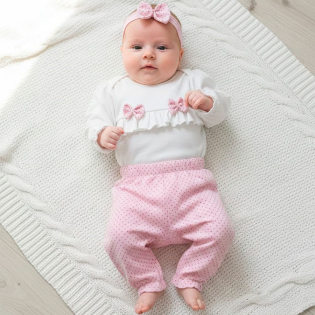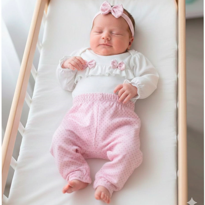 Conjunto Body Manga Longa com Mijão, Enxoval para Bebê, Coleção: Kids, Composto por 03 Peças, Detalhe: Babadinho com Lacinhos. Disponível nos Tamanhos P, M e G, Cor: Palha/Rosa Estampado, Tecido: Malha 100% Algodão.