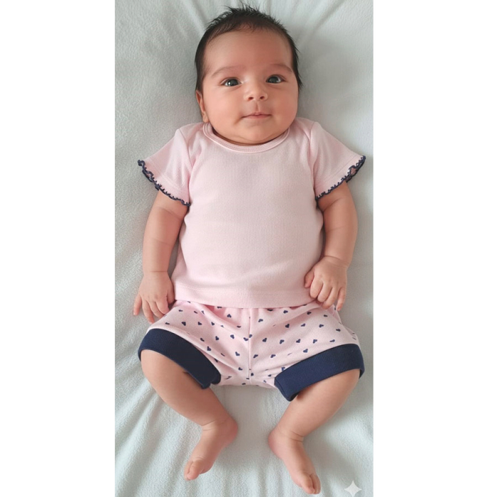 Conjunto Camiseta Manga Curta com Shorts. Coleção: Encanto, Enxoval para Bebê, Composto por 02 Peças, Disponível nos Tamanhos P, M e G, Detalhe: Manguinha com Picueta, Cor: Rosa/Marinho, Tecido: Malha Canelada 100% Algodão.