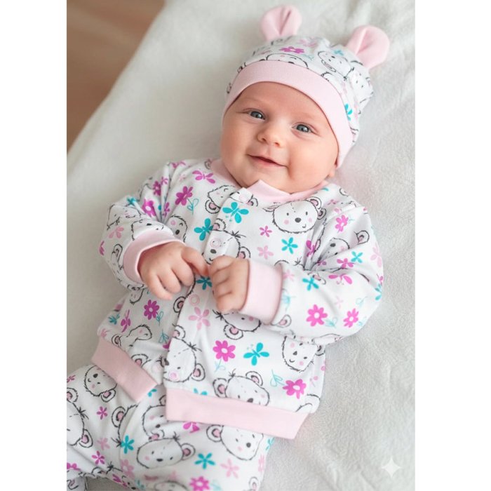 Conjunto Pijaminha Casaquinho com Mijão + Touca, um conjunto elegante e cheio de estilo para sua princesinha esbanjar charme para onde for. Esse conjuntinho é ideal para os dias mais frios para aquecer e proteger sua princesinha. Serve como um pijama bem confortável para a hora do soninho. Possui fechamento por botões de pressão frontal.