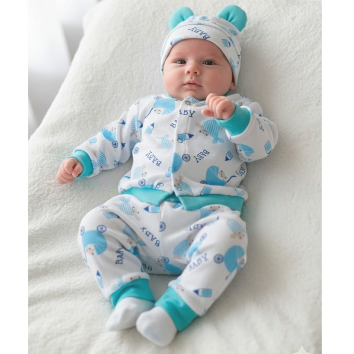 Conjunto Pijaminha Casaquinho com Mijão + Touca, um conjunto elegante e cheio de estilo para seu bebê esbanjar charme para onde for. Esse conjuntinho é ideal para os dias mais frios para aquecer e proteger seu príncipe. Serve como um pijama bem confortável para a hora do soninho. Possui fechamento por botões de pressão frontal.