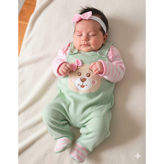 A Jardineira com o body manga longa formam um look charmoso e confortável para seu bebê. As peças podem ser utilizadas para compor looks diferentes. Confeccionado em malha, que possui toque macio para o contato com a pele sensível do bebê. Sem contar nesse bordado de ursinho super fofo. O botão da jardineira encapado traz um toque especial e alegre para o macacão levando mais encanto para o look e uma faixinha de cabelo bem delicada para sua princesinha arrasar.