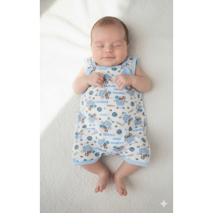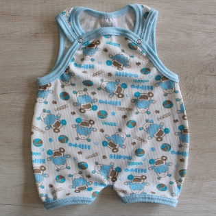 Jardineira Verão, Composto por 01 Peça, Disponível nos Tamanhos P, M e G, Detalhe: Botões de Pressão, Cor: Estampado/Azul, Tecido: Malha Canelada.