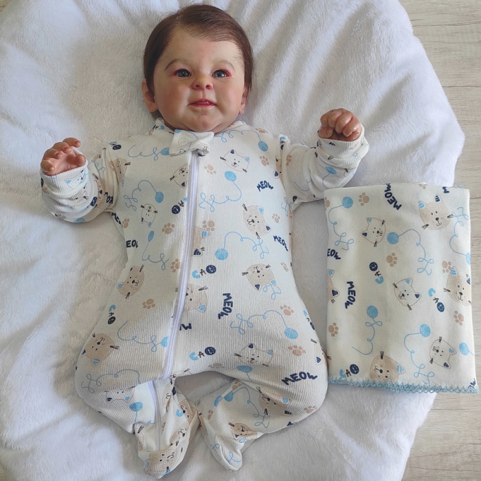 Kit Macacão Manga Longa em Ziper Pijama com Cueiro Soninho Gatinho Azul