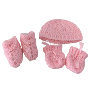 Kit Touca, Sapatinho e Luvinhas Recém Nascido Tricô Rosa