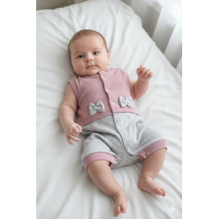 Macacão Curto, Coleção: Casual, Composto por 01 Peça, Disponível nos Tamanhos RN, P, M e G, Detalhe: Lacinhos, Cor: Rosê/Mescla. Tecido: Malha Canelada 100% Algodão.
