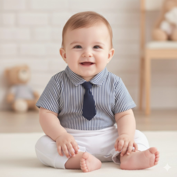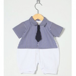 Macacão Curto Gravatinha Listrado Marinho, Enxoval Bebê Menino, Cor Branco/Listrado Marinho, Tecido Malha 100% Algodão.