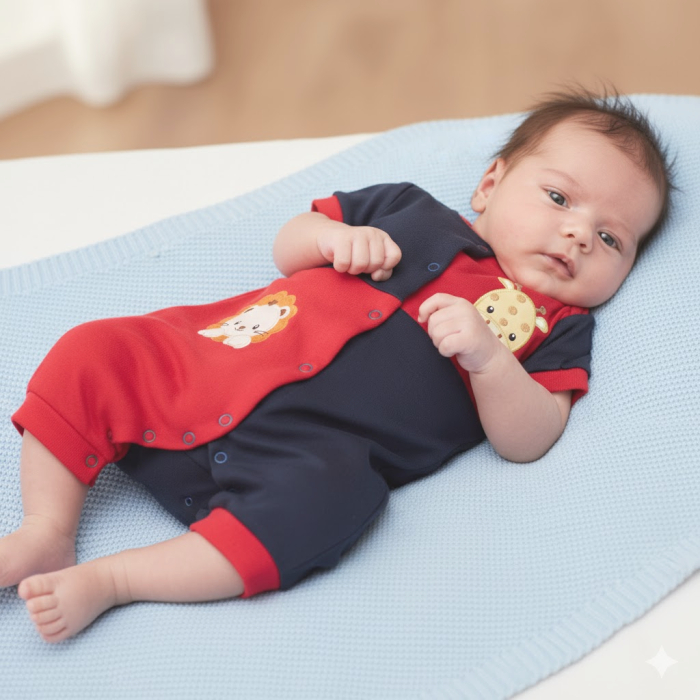Macacão Manga Curta, Enxoval para Bebê Menino, Composto por 01 Peça, Disponível nos Tamanhos P, M e G, Detalhe Bordado, Cor Marinho/Vermelho, Tecido Malha 100% Algodão.