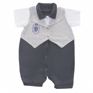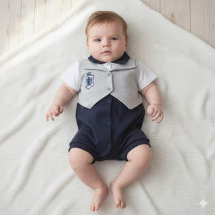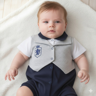 Macacão Manga Curta com Colete Acoplado, Enxoval para Bebê Menino, Composto por 01 Peça, Disponível nos Tamanhos P, M e G, Detalhe Bordado e Gravatinha, Cor Marinho/Mescla Cinza/Branco, Tecido Malha 100% Algodão.