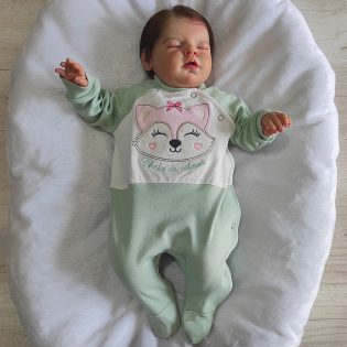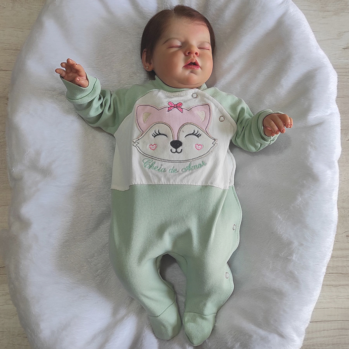 Macacão Manga Longa, Coleção: Boomer. Enxoval para Bebê Menina, Composto por 01 Peça, Disponível nos Tamanhos RN, P e M. Detalhe: Bordado. Cor: Verde/Palha, Tecido: Malha Suedine 100% Algodão.