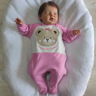 Macacão Manga Longa, Coleção: Boomer. Enxoval para Bebê Menina, Composto por 01 Peça, Disponível nos Tamanhos RN, P e M. Detalhe: Bordado. Cor: Rosa Chiclete/Palha, Tecido: Malha Suedine 100% Algodão.
