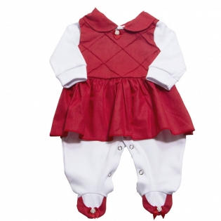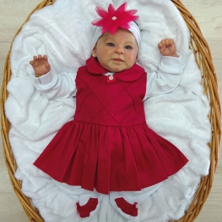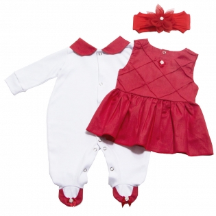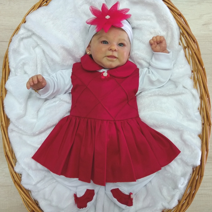 Conjunto Macacão Manga Longa com Vestido + Faixa de Cabelo Bela, Enxoval para Bebê Menina, Composto por 03 Peças, Detalhe Nervura, Disponível nos Tamanhos RN, P, M e G, Cor Branco/Vermelho, Tecido e Malha Suedine 100% Algodão.
