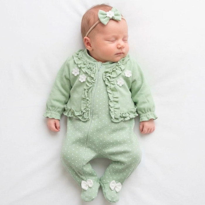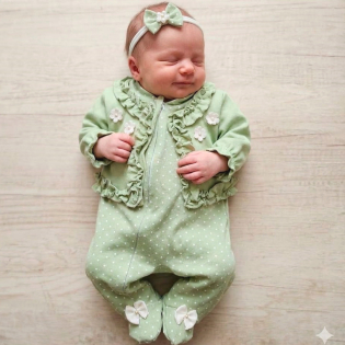 O macacão, de manga longa exibe uma delicada e sutil estampa floral, trazendo um visual clássico e elegante. O fechamento é prático, com botões de pressão discretos ao longo de todo o comprimento, facilitando a troca.