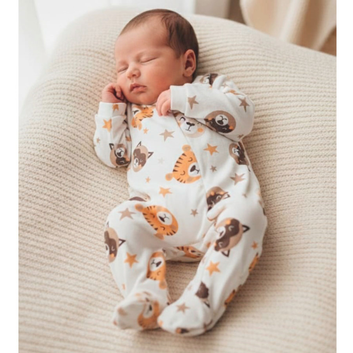 O zíper frontal discreto com proteção interna facilita na hora de vestir e trocar, garantindo praticidade no dia a dia, além de um acabamento delicado que não incomoda a pele sensível do bebê. O design conta com estampas suaves e modernas, perfeitas para um visual fofo e aconchegante. Um macacão pensado para unir funcionalidade, estilo e muito carinho em cada detalhe.