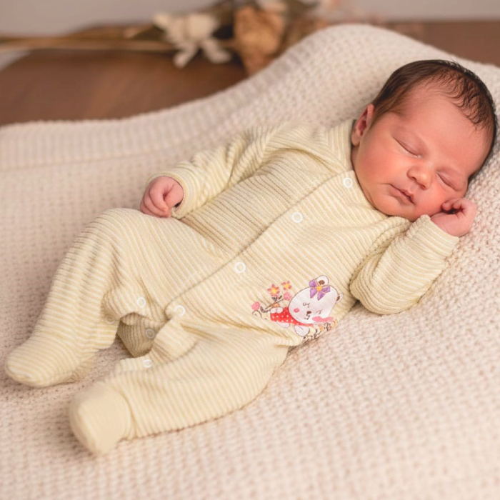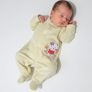Macacão Manga Longa Menina Plush Canelado, Enxoval para Bebê, Composto por 01 Peça, Disponível nos Tamanhos RN, P, M e G. Detalhe: Bordado, Cor: Listrado Amarelo, Tecido: Plush 80% Algodão 20% Poliester. ATENÇÃO: TAMANHO M POSSUI PEZINHO REVERSIVEL.