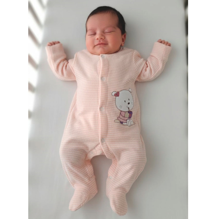 Macacão Manga Longa Menina Plush Canelado Enxoval para Bebê, Composto por 01 Peça, Disponível nos Tamanhos RN, P, M e G. Detalhe: Bordado, Cor: Listrado Salmão, Tecido: Plush 80% Algodão 20% Poliester. ATENÇÃO: TAMANHO M POSSUI PEZINHO REVERSIVEL.
