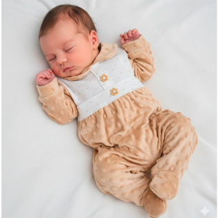 Macacão Manga Longa Plush, Enxoval para Bebê. Composto por 01 Peça, Disponível nos Tamanhos P e M, Detalhe: Aplicação de Florzinha, Cor: Palha/Marrom, Tecido: Plush/Malha 100% Algodão. ATENÇÃO: TODOS OS TAMANHOS POSSUI PEZINHO.