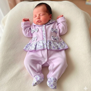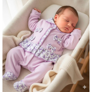 Macacão Manga Longa Plush, Enxoval para Bebê. Composto por 01 Peça, Disponível nos Tamanhos P e M, Detalhe: Lacinhos com Pérola/Acabamento Picueta, Cor: Lilás/Lvanda, Tecido: Plush 100% Algodão. ATENÇÃO: TODOS OS TAMANHOS POSSUI PEZINHO.