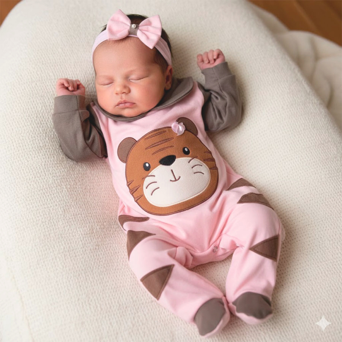 O Macacão é a peça coringa que não pode faltar no enxoval do seu bebê, além de ser muito utilizado é um item tradicional que pode ser usado em todas ocasiões, e para acompanhar um lindo bordado de tigre que é um charme. Acompanha uma faixinha de cabelo para dar ainda mais charme ao look. Esse modelinho é um encanto.