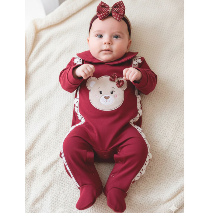 O Macacão é a peça coringa que não pode faltar no enxoval do seu bebê, além de ser muito utilizado é um item tradicional que pode ser usado em todas ocasiões, e para acompanhar um lindo bordado de ursinha que é um charme. Acompanha uma faixinha de cabelo para dar ainda mais charme ao look. Esse modelinho é um encanto.
