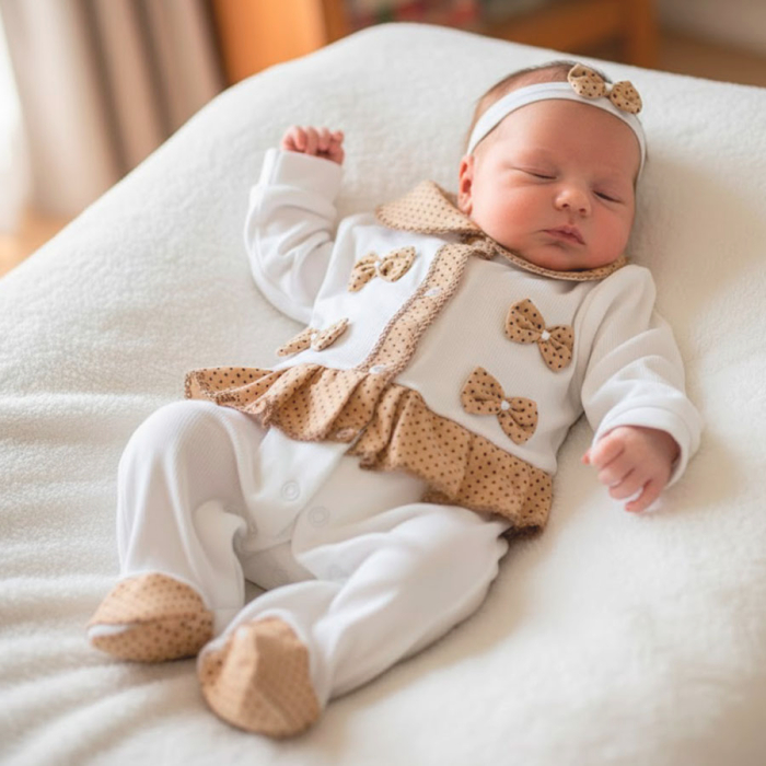 O Macacão é a peça coringa que não pode faltar no enxoval da sua bebê, além de ser muito utilizado é um item tradicional que pode ser usado em todas ocasiões, esse lindo modelo acompanha uma faixa de cabelo para levar ainda mais charme e elegância para sua princesa. Confeccionado em malha canelada que possui toque macio para o contato com a pele sensível da bebê. Esse modelinho é um encanto que irá proteger e aquecer ainda mais sua bebê.