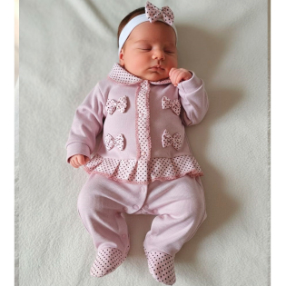 Macacão Manga Longa com Faixa de Cabelo, Enxoval para Bebê. Composto por 02 Peças, Disponível nos Tamanhos P e M, Detalhe: Lacinhos com Pérola, Cor: Rosê, Tecido: Malha Canelada. ATENÇÃO: Tamanho M não possui pezinho.