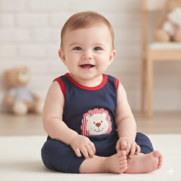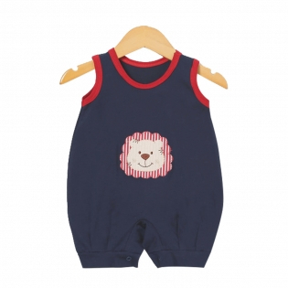 Macacão Regata Verão Henrique, Enxoval para Bebê Menino, Composto por 01 Peça, Disponível nos Tamanhos P, M e G, Detalhe Bordado, Cor Marinho/Vermelho, Tecido Malha 100% Algodão.