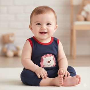 Macacão Regata Verão, Enxoval para Bebê Menino, Composto por 01 Peça. Os Dias mais Quentes pedem uma Roupinha Aconchegante e Confortável, O Macacão Regata irá deixar seu Bebê Super á Vontade e Charmoso. Com Botões de Pressão para Facilitar na Troca de Fraldas.