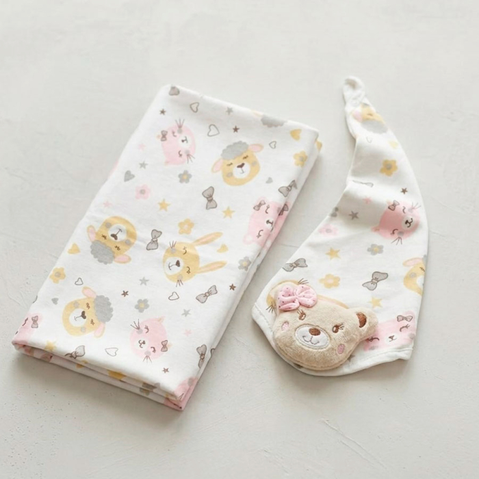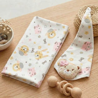 Este kit combina a praticidade de uma manta leve com o acolhimento de uma naninha com personagem em pelúcia, criando um ambiente de segurança e paz para o sono da bebê. Desenvolvido para proporcionar momentos de puro aconchego e ternura. Com uma estampa única, este conjunto é a escolha ideal para mamães que amam um visual romântico e delicado no enxoval.
