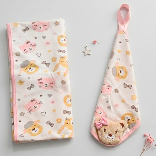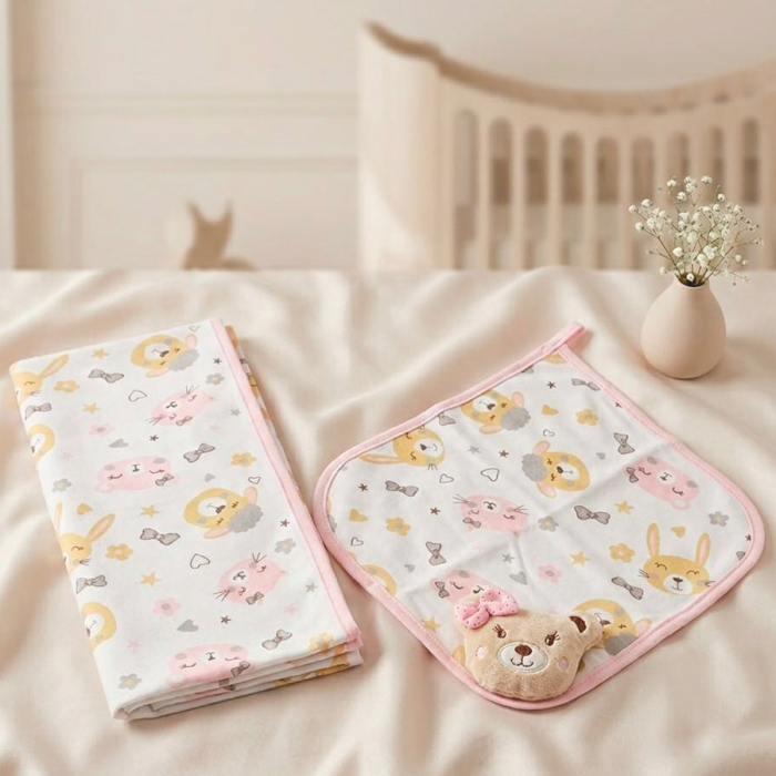 Este kit combina a praticidade de uma manta leve com o acolhimento de uma naninha com personagem em pelúcia, criando um ambiente de segurança e paz para o sono da bebê. Desenvolvido para proporcionar momentos de puro aconchego e ternura. Com uma estampa única, este conjunto é a escolha ideal para mamães que amam um visual romântico e delicado no enxoval.