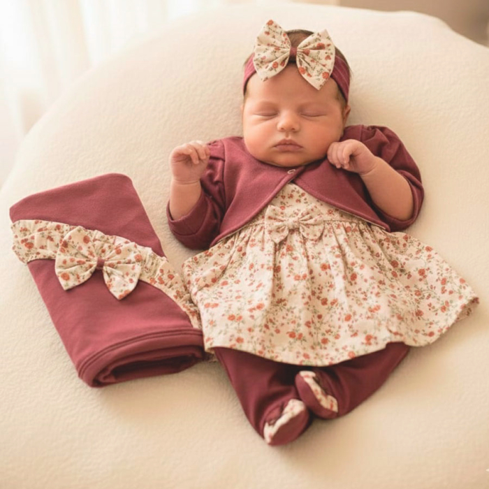 O momento da maternidade é mágico e único na vida de uma mulher, envolvido de muito amor e carinho fazendo com que a escolha da saída de maternidade seja tão importante. Aliás, será a primeira roupinha que sua bebê irá usar, escolhe com muita atenção em cada detalhe pensando em proporcionar o máximo de conforto e elegância para sua princesinha ser apresentada aos amigos e familiares. Este look envolve delicadeza e meiguice. Composto por mijão, vestidinho, casaquinho, par de luvinhas, faixa de cabelo e manta, possibilitando para mamãe mais de uma opção de look. Confeccionado em malha e tricoline.