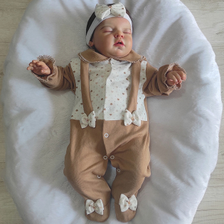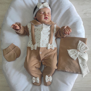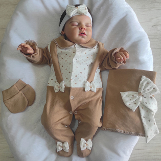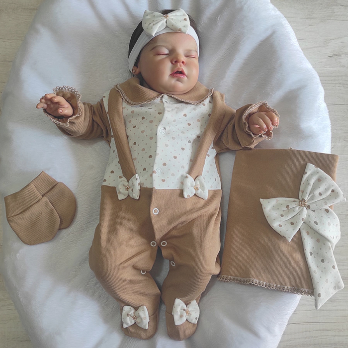 Kit Saída de Maternidade, Enxoval para Bebê. Composto por 04 Peças, Disponível no Tamanho P, Detalhe: Lacinhos com Strass, Cor: Marrom/Palha, Tecido: Malha 100% Algodão.