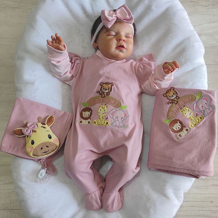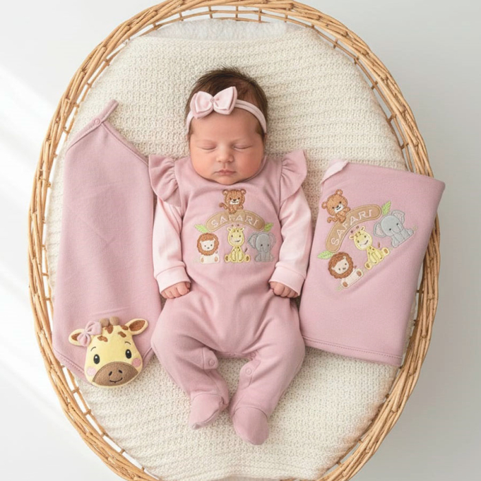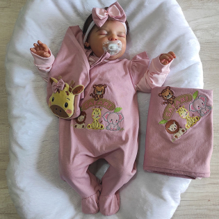 Acreditamos que o momento da maternidade é um dos mais importantes na vida de uma mulher. A escolha da saída de maternidade não poderia ser diferente, escolhe tudo com muita atenção em cada detalhe, pensando em proporcionar o máximo de conforto e estilo para sua princesa. E é pensando nisso que nós temos este lindo kit saída de maternidade. Nesse look escolhemos um Macacão Modelo Manga Longa com bordado de safari, uma delicada faixinha de cabelo, uma naninha temática com a carinha de girafinha e a peça principal, uma manta para envolver sua bebê para que ela fique aquecida. Fechamento por botões de pressão para facilitar na troca de fraldas.