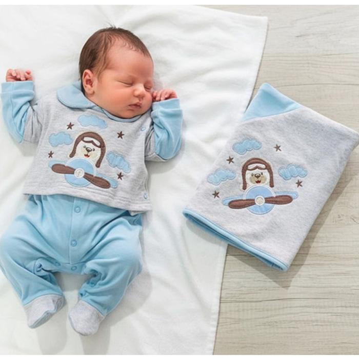 A saída de maternidade será a primeira roupinha que seu bebê irá usar, escolhe com muita atenção em cada detalhe pensando em proporcionar o máximo de conforto e elegância para seu príncipe ser apresentado aos amigos e familiares. Este look envolve muito charme, composto por macacão manga longa, boné, par de luvinhas e manta. Confeccionado em malha e tricoline que possui toque macio para o contato com a pele sensível do bebê, possui fechamento entrepernas e nas costas por botões de pressão.