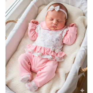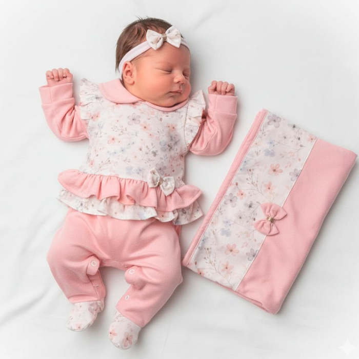 Essa saída de maternidade é uma ótima opção para sua princesa ser apresentada aos amigos e familiares. Neste look temos um delicado macacão manga longa com fechamento por botões de pressão entre pernas para facilitar a troca de fraldas, e complementando o look, uma linda faixinha de cabelo, e não podemos deixar de fora a manta que é a peça chave de toda saída de maternidade. Confeccionada em malha 100% algodão para manter sua bebê aquecida e confortável com estilo.