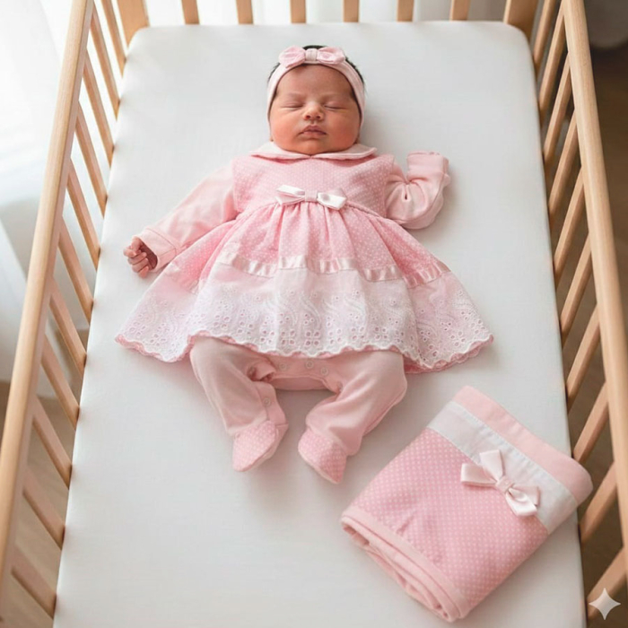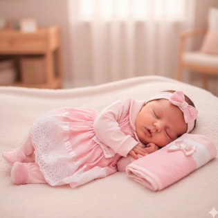 Essa saída de maternidade é uma ótima opção para sua princesa ser apresentada aos amigos e familiares. Neste look temos o macacão manga longa com o vestidinho que da duas opções de uso, e complementando o look uma linda faixinha de cabelo, par de luvinhas e não podemos deixar de fora a manta que é a peça chave de toda saída de maternidade. Confeccionada em malha e tricoline 100% algodão para manter sua bebê aquecida e confortável com estilo. Com botões de pressão para facilitar na troca de fraldas.