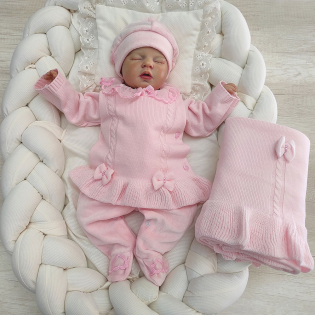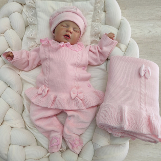O momento da maternidade é um momento mágico e único na vida de uma mulher, que envolve muito amor e carinho e a escolha da saída de maternidade não poderia ser diferente, ficar atenta á cada detalhe e escolher com muita dedicação pensando em proporcionar o máximo de conforto e elegância para sua princesinha ir para casa. Essa saída de maternidade é uma ótima opção. Neste look temos um elegante macacão manga longa com detalhes em renda, uma touca e para complementar o look, e não podemos deixar de fora a manta que é a peça chave de toda saída de maternidade. Peças confeccionadas em tricô, a manta possui forro de malha para aquecer ainda mais sua bebê.