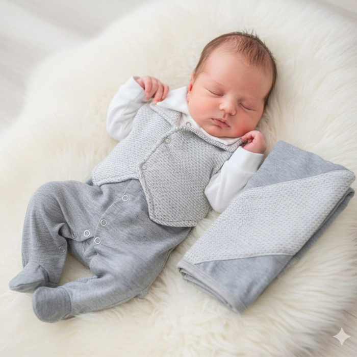 A chegada do bebê é um dos momentos mais especiais da vida, e essa saída de maternidade foi criada para tornar esse dia ainda mais inesquecível. Um conjunto sofisticado, atemporal e extremamente confortável, pensado especialmente para os primeiros dias do recém-nascido. ideal para quem busca elegância, delicadeza e versatilidade Macacão longo com fechamento por botões de pressão e com pezinho fechado, garantindo que o bebê fique sempre aquecido, Colete estilo social, com modelagem delicada e acabamento impecável e a Manta, ideal para envolver o bebê com suavidade e aconchego.