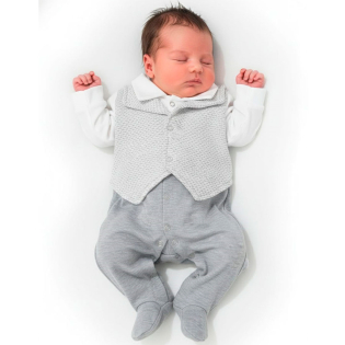 Saída de Maternidade Sonho Meu. Enxoval para Bebê Menino, Composto por 02 Peças, Disponível no Tamanho Único, Detalhe: Falso Colete Fixado no Macacão. Cor: Mescla Cinza/Palha. Tecido Malha 100% Algodão.