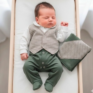 Saída de Maternidade Sonho Meu. Enxoval para Bebê Menino, Composto por 02 Peças, Disponível no Tamanho Único, Detalhe: Falso Colete Fixado no Macacão. Cor: Verde Militar/Palha. Tecido Malha 100% Algodão.