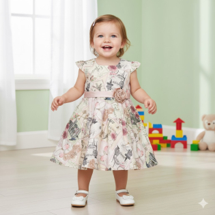 Vestido Verão North Paris, Enxoval para Bebê Menina, Composto por 01 Peça, Disponível nos Tamanhos 1, 2 e 3, Detalhe Flor de Cetim na Cintura, Cor Estampado.