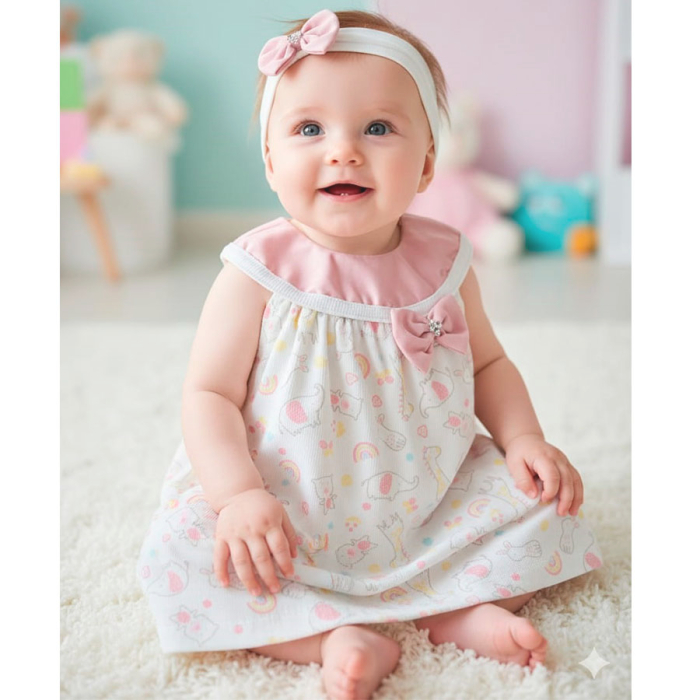 Vestido Verão, Enxoval para Bebê Menina, Composto por 02 Peças, Disponível nos Tamanhos P, M e G/1,2 e 3. Detalhe: Aplicação de strass, Cor: Rosê/Estampado Palha. Tecido: Malha Canelada 100% Algodão.