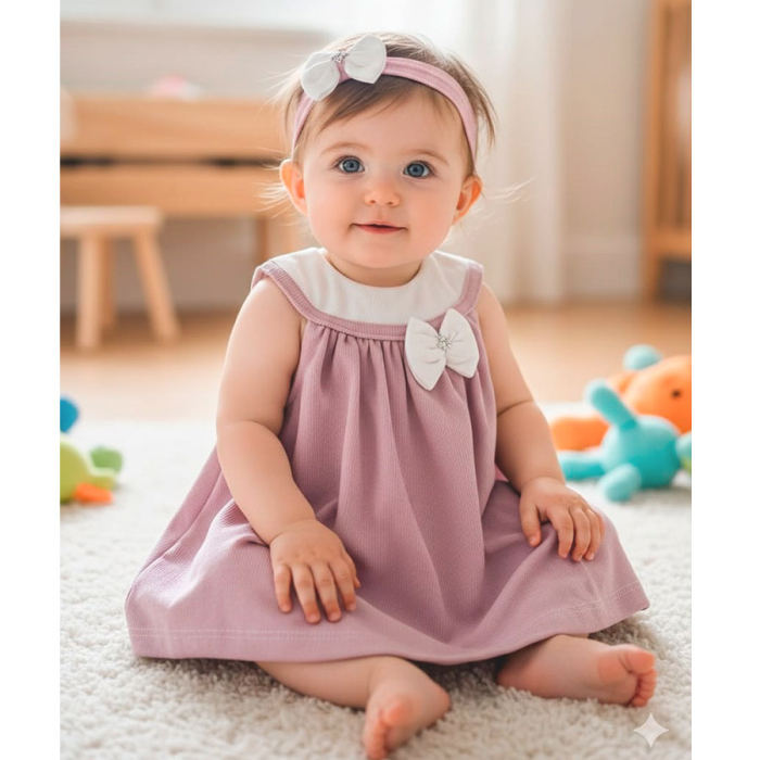 Vestido Verão, Enxoval para Bebê Menina, Composto por 02 Peças, Disponível nos Tamanhos P, M e G/1,2 e 3. Detalhe: Aplicação de strass, Cor: Rosê/Palha. Tecido Malha Canelada 100% Algodão.