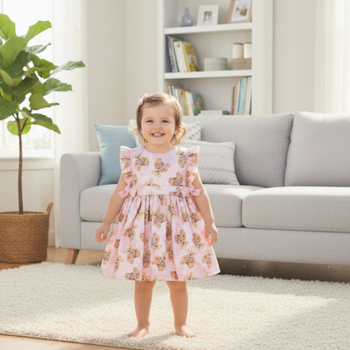 Vestido Verão, Enxoval para Bebê Menina, Composto por 01 Peça, Disponível no Tamanho 1, Detalhe: Babadinho, Cor: Rosê/Estampado. Tecido: Tricoline 100% Algodão.